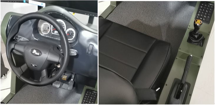 2)開放式艙體,方向盤、變速機(jī)構(gòu)、手制動、加油踏板、制動踏板、離合器踏板等實裝主要操作部件均需要模擬,其外觀尺寸、部署相對位置、操作行程,以及操作力度感受與實際基本一致,操縱機(jī)件性能工作可靠、操作靈活、低噪音。