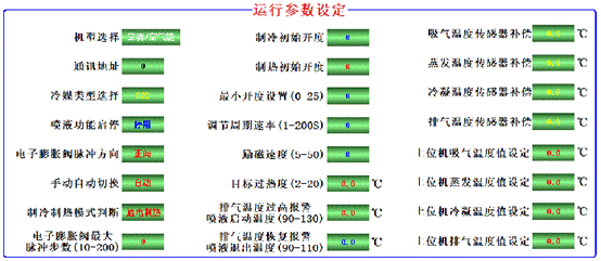 路參數(shù)控制參數(shù)設(shè)置/查詢:控制器內(nèi)所有與控制相關(guān)的溫度參數(shù)、時間參數(shù)、控制參數(shù)、等29個參數(shù)都可以調(diào)整,以適應(yīng)制冷/熱泵/冷庫/水機等設(shè)備。
