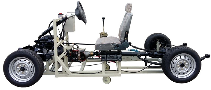 包括前后懸掛系、轉(zhuǎn)向系、傳動(dòng)系、手動(dòng)變速器及掛檔機(jī)構(gòu)、制動(dòng)系等系統(tǒng)、安裝腳輪的可移動(dòng)式臺架等組成。