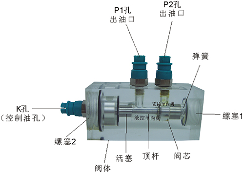 2、液控單向閥結(jié)構(gòu)上參考了國(guó)產(chǎn)IY-25B型液壓?jiǎn)蜗蜷y,其閥體、螺塞等采用了進(jìn)口透明有機(jī)玻璃材料精制而成,閥芯、頂桿采用了45#中碳鋼材料,并配合彈簧,油接頭,密封圈等標(biāo)準(zhǔn)件裝配而成,通過它可明確地觀察到活塞、彈簧、油孔等結(jié)構(gòu)及其運(yùn)行過程,具有形象逼真,性能可靠等優(yōu)點(diǎn)。它即可作為教學(xué)模型,也可以作為液壓實(shí)驗(yàn)元件進(jìn)行實(shí)驗(yàn)演示。