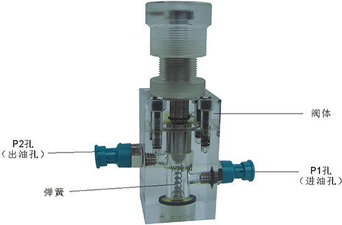 2、溢流閥結(jié)構(gòu)上參考了國(guó)產(chǎn)P-63B型低壓直動(dòng)式溢流閥,其閥體閥蓋、鎖緊螺母、調(diào)節(jié)螺母、螺塞等采用了進(jìn)口透明有機(jī)玻璃材料精制而成,閥芯、調(diào)節(jié)桿采用了45#中碳鋼材料。并配合彈簧,油接頭,密封圈等標(biāo)準(zhǔn)件裝配而成,通過它可明確地觀察到閥芯、彈簧、油孔等結(jié)構(gòu)及其運(yùn)行過程,具有形象逼真,性能可靠等優(yōu)點(diǎn)。它即可作為教學(xué)模型,也可以作為液壓實(shí)驗(yàn)元件進(jìn)行實(shí)驗(yàn)演示。