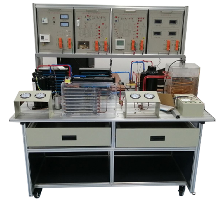 實訓(xùn)桌采用工業(yè)標(biāo)準(zhǔn)鋁型材件與鈑金結(jié)構(gòu)件拼裝而成,結(jié)構(gòu)堅固,造形美觀大方;設(shè)有二個大抽屜,用于放置實訓(xùn)導(dǎo)線或工具等。實訓(xùn)桌臺面用于放置熱泵型家用空調(diào)和空氣源熱泵系統(tǒng)的元器件并提供一個寬敞舒適的工作臺面,學(xué)生可以在工作臺面上將制冷系統(tǒng)的器件任意安裝,實訓(xùn)桌還設(shè)有四個萬向輪,便于移動和固