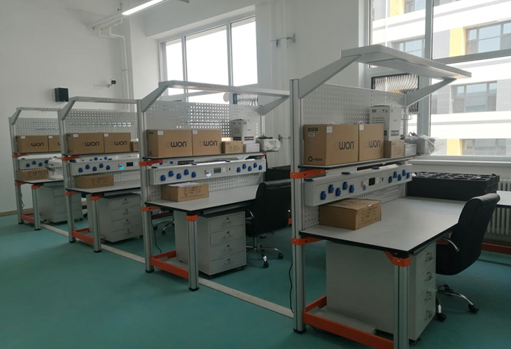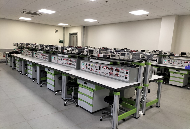 電子工藝實習室是供學生焊接練習、電子產(chǎn)品組裝調(diào)試操作的實驗室,學生進行焊接操作。配備的儀器設(shè)備主要有直流穩(wěn)壓電源、示波器、萬用表、工具箱等。為了改善實習室的空氣環(huán)境衛(wèi)生,還專門配備了抽風系統(tǒng)。開設(shè)的課程有《電子工藝實習》、《電工實習》,包括電路元件的選配、電子產(chǎn)品的安裝、焊接和性能測試等環(huán)節(jié)。電子工藝實驗實訓室設(shè)備主要面向汽車、機械、電信、電氣、計算機、經(jīng)濟、管理等學院的學生,培養(yǎng)學生的動手實踐能力、分析問題和解決問題的能力以及創(chuàng)新精神。