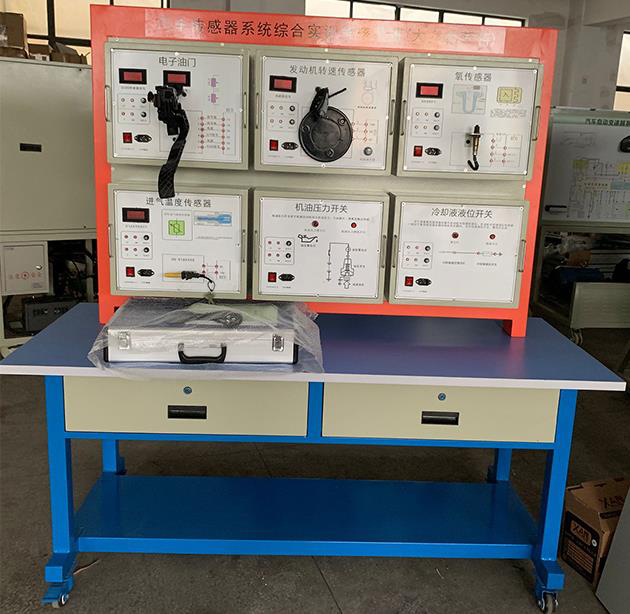 本實訓裝置采用全新原廠BOSCH ME7.5電噴系統(tǒng)中的傳感器,包括空氣流量傳感器、進氣溫度傳感器、發(fā)動機轉速傳感器、冷卻液溫度傳感器、氧傳感器、爆震傳感器、霍爾傳感器、增壓壓力傳感器、機油壓力開關、冷卻液液位開關和電子節(jié)氣門組件等汽車傳感器。系統(tǒng)部件均采用獨立的模塊化結構,更換方便,能根據(jù)需要擴展功能或開發(fā)新的實訓項目,并與電路圖符號相對應,需通過專用導線連接而構成汽車傳感器系統(tǒng),訓練學生對傳感器的維修判斷能力。利用儀表可方便的在面板的連接插孔或檢測插孔上讀取檢測信號。